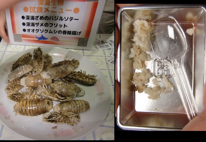 横浜中華街にある ヨコハマおもしろ水族館にて 第3回深海祭りがあり そこでオオグソクムシの揚げ物が試食できるらしい 試食できるのは先着100名らしいので イベント開始時間の2時間ぐらい前に行く 既に50人ぐらい並んでいたが 無事に整理券を手に入れて食べれました。 オオグソクムシは海底にいる虫で だんごむしを大きくした奴です。 虫が苦手な人は駄目な感じかもしれません 左側がオオグソクムシを揚げた物で 右側がその身の部分です。 どうも 殻の部分は本気で硬いので食べれないので 身を取り出して食べるのだそうです。 味は海老や蟹に近い味な気がします 本体を見ない限りは美味しく食べれそうな気がします。 |